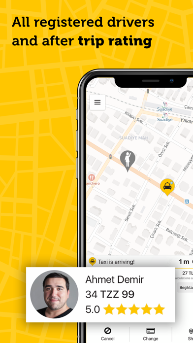 BiTaksi finds the nearest taxi around and directs it to you. You can see driver's name, photo, ratings and license plate as well as the ETA on a live map. Pay with cash, credit card or BKM Express. At the end of your trip you can rate your driver and write comments.