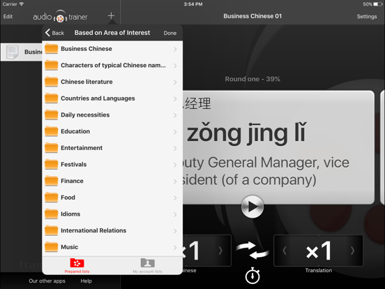 • You can throw away those old language courses on CD. In the Audio Trainer you can control the order and number of Chinese and English repetitions, and make words appear more or less frequently depending on how interested you are in them.