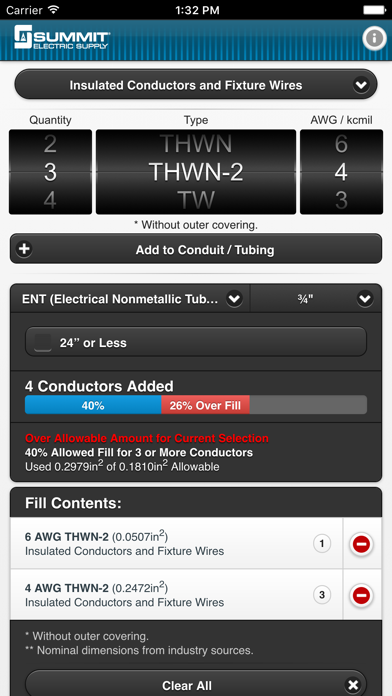 As you add and remove conductors, the app automatically calculates the permitted fill rates from the 2011 NEC, keeping you within code. Allowable fill rates adjust automatically for differences in conductor count and for conduit or tubing lengths of 24” or less.