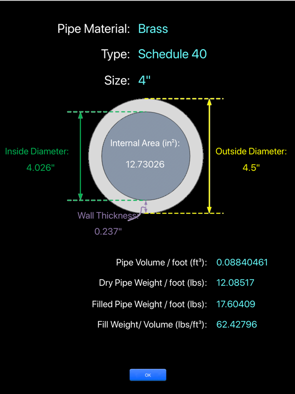 • Solves for inside diameter, outside diameter, internal area, wall thickness, pipe volume per foot, dry pipe weight per foot, and filled pipe weight per foot