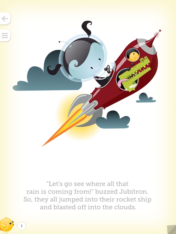 In this adventure Jubitron and her friends Mr. Alligator and Little Birdie decide to go on a lovely little picnic. But when their picnic is interrupted by a rain storm, Jubitorn has a bright idea and with the help of her friends (and a rocket ship) they save the day and make a new friend while they're at it.
