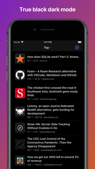 Hackers is the ultimate app for Hacker News. We focus on the reading experience, with a simple yet beautiful UI and clean typography. Navigate large comment threads with ease just by swiping left. Up vote posts and comments by swiping right.