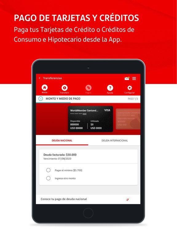 Accede directamente con tu huella digital o reconocimiento facial y podrás consultar tu saldo, realizar Transferencias a Terceros, pagar la deuda nacional de tu Tarjeta de Crédito en cuotas, pagar tus cuentas en línea una a una o en multipago, pagar cuotas de tus productos de Crédito, bloquear y desbloquear tarjetas, también te permite invertir y monitorear tus inversiones.