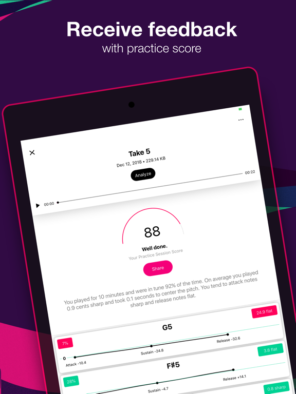 • It's like a music instructor in your pocket. Record a practice session and get a practice score with note graphs to help summarize your playing.