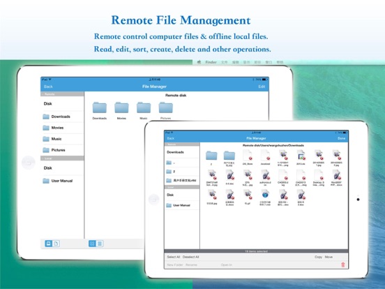 - You can access the shared folders on remote computer.you can copy files from remote computer to your iPhone/Pad local disk,the same upload from local disk to remote computer.Also you can read online.