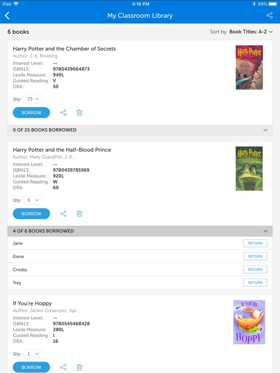But wait, there’s more: one of the newest features of the Scholastic Book Wizard app is the new “Borrow” feature. Now students can borrow books from their classroom library to continue independent reading at home! Teachers simply hit the “Borrow” button, check out the book to the student, and then check it back in when the student has returned the book! No more missing books!