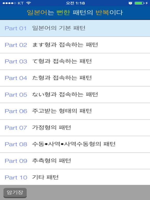 ① 각 part의 패턴 리스트에서 일본어와 우리말 패턴을 번갈아 가며 클릭하여 전체 180개의 패턴을 듣고 보며 암기 연습.