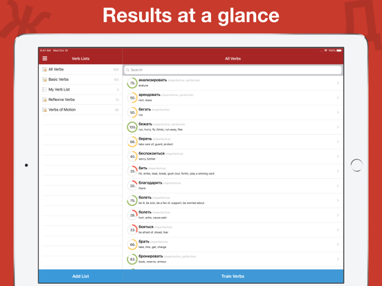 VERB LISTS: make your own lists of verbs or use the predefined lists: "All Verbs", "Basic Verbs", "Reflexive Verbs" and "Verbs of Motion".