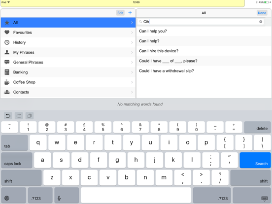 Use Phrase Prediction when typing into the Message Window. The phrases are loaded from the contents of the visible categories and ClaroCom stores new phrases that are typed or added. The predicted phrases appear on a Phrase bar above the keyboard. Phrases can be easily searched for, and bulk phrases can be easily added.
