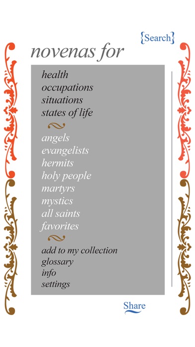 To help you find a saint that can aid you with your specific dilemma, we have divided this app of thirty-six saints into four categories: Health, Occupations, Situations and States of Life. You can find your saint by personally relating to their history, by being drawn to the illustrated depictions in their holy cards, or by searching the Glossary of extensive problems and life situations.