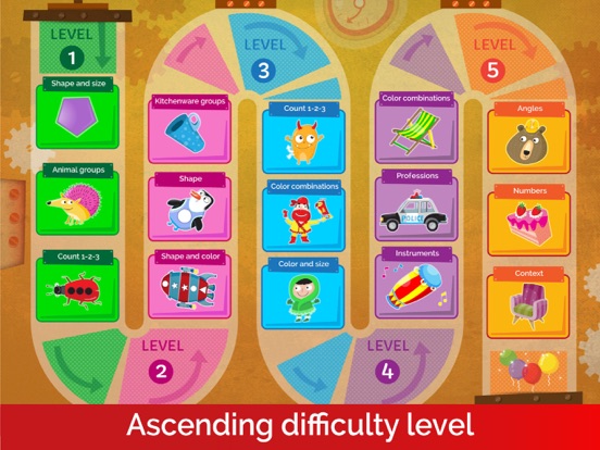 This game is intended for toddlers aged 3+. The game presents 12 boards each focused on developing a set of basic concepts such as size, colors, numbers and patterns using everyday objects from the child's world such as clothes, food and many more.