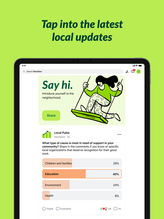 Nextdoor is a trusted environment where all neighbors are verified, making it safe to share online the kinds of things you'd be okay sharing with your neighbors in person.