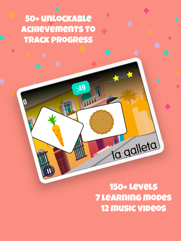 • 150+ levels including basic vocab topics such as Numbers, Colors, Animals, Food, and more; and a verb topics like AR, ER, and IR verbs in the Present and Past Tense.