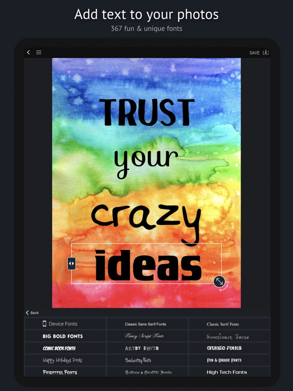 - Text styles like outline, drop shadow and text bubbles
