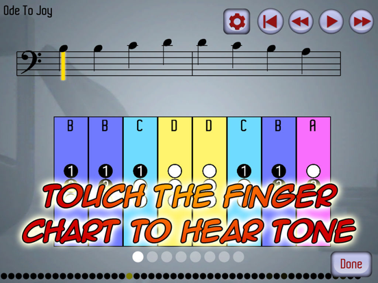 -Beginners can choose to have finger charts displayed under each note on the staff as they play.