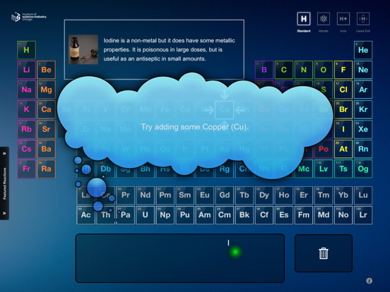 - Initiate nearly 300 virtual chemical reactions by dragging elements into the Reaction Area.