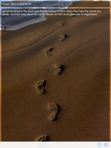 Psalm-A-Day delivers a new Bible verse selection from the book of Psalms each day, it allows you to select a preferred translation and provides the ability to share your experience with friends over e-mail, SMS, and social network mediums such as Facebook.