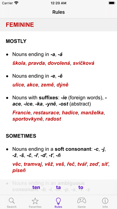 3. The Game – To practice the rules play the Game. Choose the gender of 4000 randomly presented Czech nouns with 3 levels of difficulty. Adjectives in the answers and the English translation of the nouns will help you remember them faster. Incorrectly answered words are recycled back into the game.
