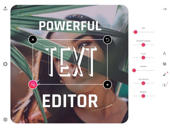 • Powerful text editing capabilities including text curving, opacity controls, and shadow.