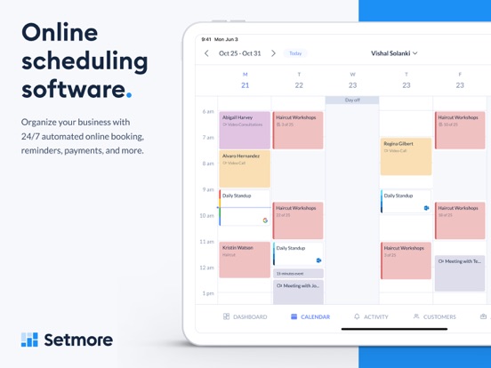 Setmore offers a free online scheduling platform for you to connect with your customers. Book and manage appointments, video meetings, and classes through one sleek calendar system.