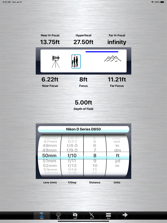• DoF includes Hyperfocal information and uses easily thumbwheel settings for fast inputs without typing.