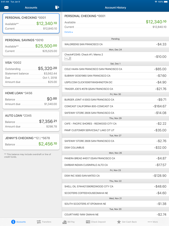 BALANCES -- View up to the minute balances and detailed transactional history, including check images, on all of your deposit and loan accounts.