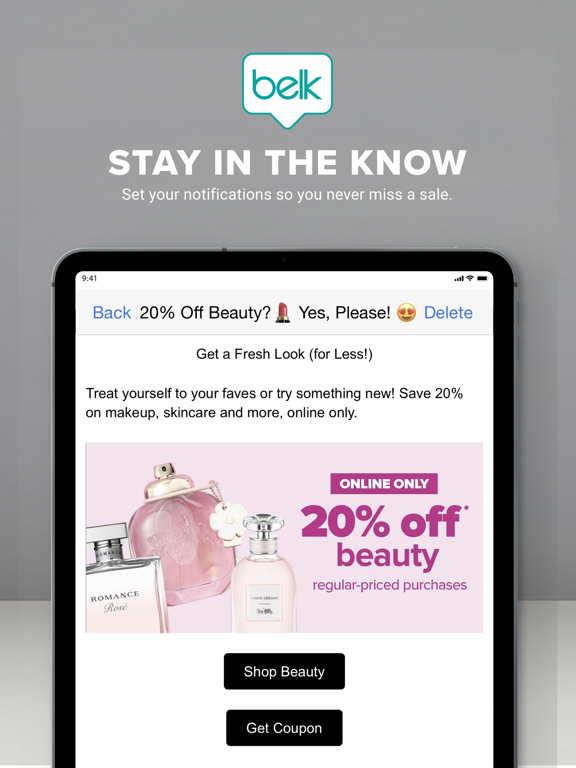 Get push notifications on your phone to be the first to know about great deals and our latest coupons. You can earn and redeem Belk Bucks when you shop in the app, too!