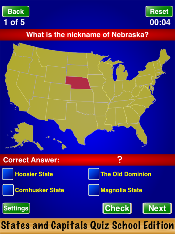 Test your knowledge of the states and capitals of the U.S. Select the test mode, difficulty level, and number of questions in the "Settings" screen. Play until you master the game.
