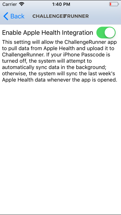 It is now possible for ChallengeRunner to pull steps, active minutes, distance and calories from the Apple Health app. To turn on this functionality, enable the Health Integration switch in Settings and accept the HealthKit privileges when prompted in the ChallengeRunner app. With HealthKit enabled, ChallengeRunner will sync with the Health app whenever the ChallengeRunner app is opened.