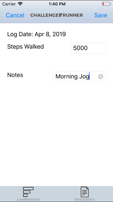 This application features a simple challenge logging interface and operates much like any other utility on the iPhone. While it does not provide detailed reports and functions besides data entry and a real-time challenge leaderboard, these features and more are available in your ChallengeRunner.com account created by your wellness program administrator.