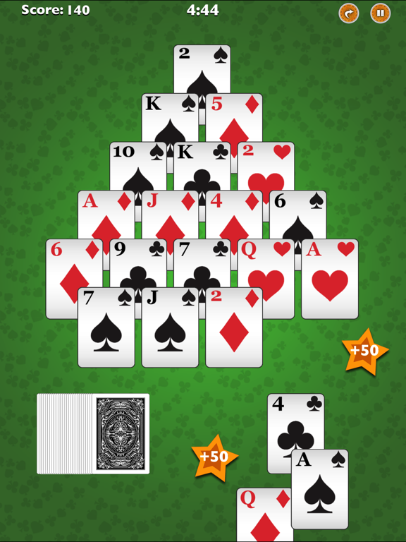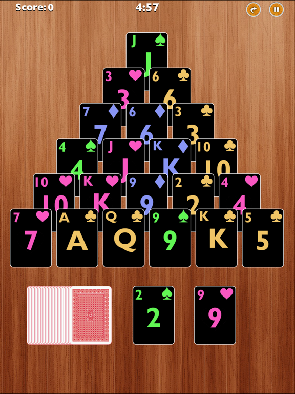 The object of the game is to clear all the cards in the pyramid. 21 cards are dealt in the shape of a pyramid in successive rows of from 1 to 6 cards. Each card is overlapped by 2 cards from the row below. A card in the pyramid is available if it is not covered by another card.