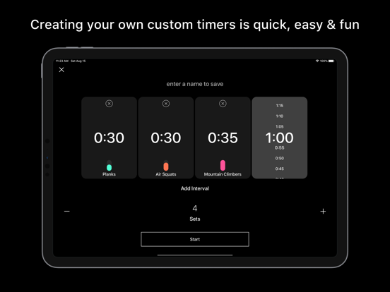Intuitive gesture controls empower you to make and share timers in mere seconds, not fumbling through multiple screens. Swipe up and down to change duration. Tap and swipe up and down to increase or decrease intensity. You can name each interval to match your exercise.