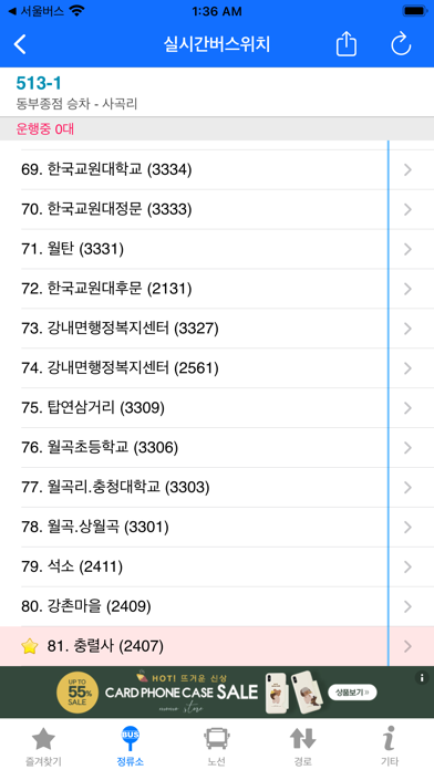 실시간도착정보는 청주시버스정보시스템에서 제공되며. 서버 상황에따라 오차가 발생하거나 제공되지 않을 수도 있습니다. [즐겨찾기] - 자주 이용하는 정류장 및 노선을 즐겨찾기로 등록 - 즐겨찾기 메모 기능 [정류장검색] - 정류장 검색 및 버스 도착 시간과 현재 위치 제공 - GPS를 연동한 주변 정류장 찾기 [버스검색] - 버스 노선 제공 및 버스 현재위치 제공 - 버스 운행시간표 제공 - 전체 노선 경로 제공 [정보] - 노선정보업데이트 # 필수적 접근 권한 안내 # 위치권한 : 주변정류소 검색을 위해 위치정보 권한이 필요합니다. # 허용 안 함 : 주변 정류소 검색 기능을 사용할 수 없습니다.