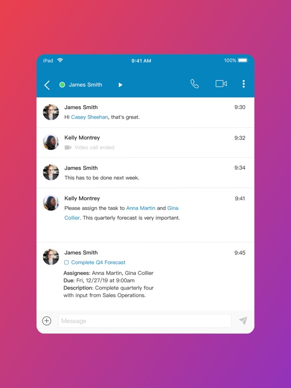 - Built-in team messaging to chat with others before, during, and after the meeting
