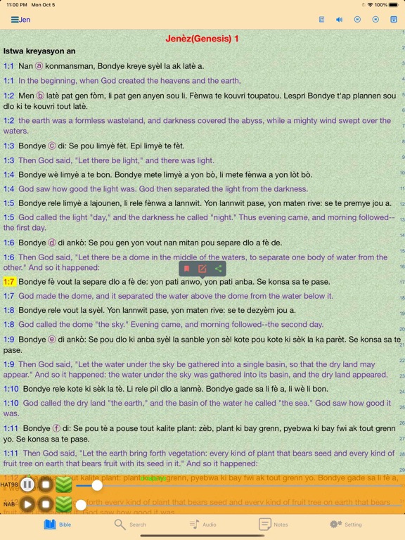 Bible Haitian Creole Version, HT 1998 (Haitian Creole) Free. The app contains multiple versions of the Bible and in English and Haitian Creole languages. You can download the audio and use the offline verses without the need to be connected to the Internet.