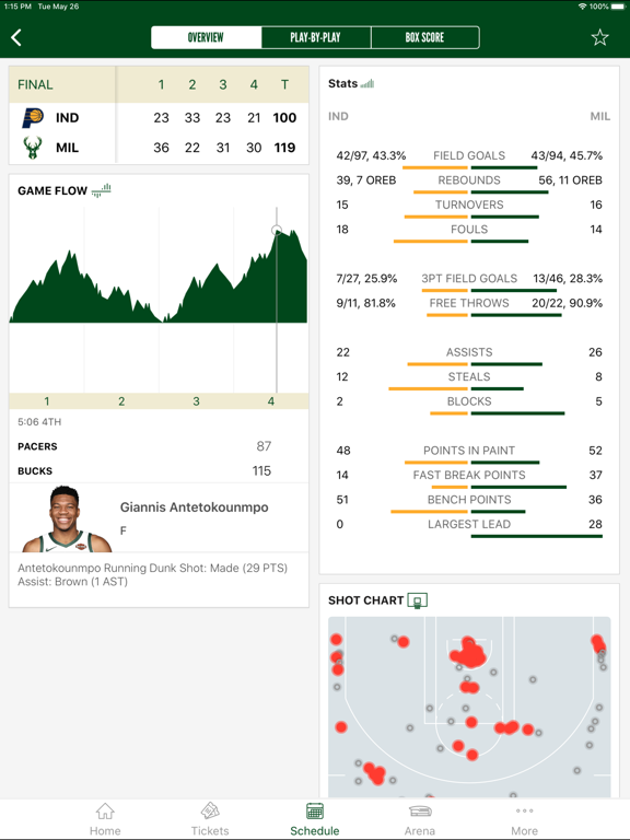- Interactive box scores with player stats, sortable play-by-play and shot tracking