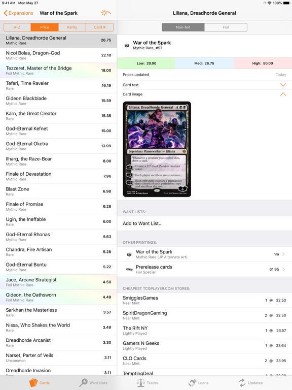 • Want Lists show total value and can be sorted alphabetically, by price or by rarity.