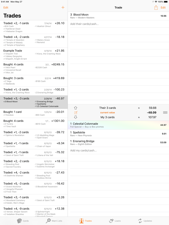 MTG Trades gives you the tools you need for trading Magic cards, right at your fingertips. It includes card prices by expansion or card name, lets you evaluate trades and view your trade history, store a watchlist of wanted cards, and allows you to track cards you have loaned or borrowed.