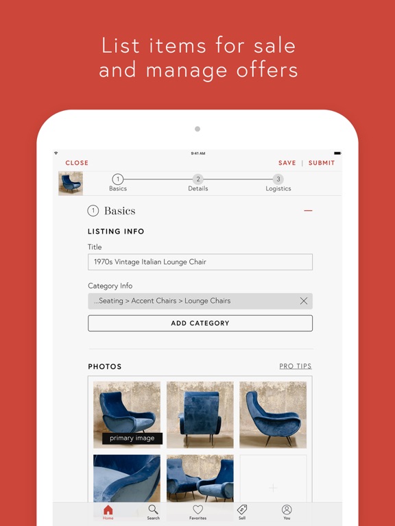 Our app also allows sellers to easily submit items for sale. All submissions are reviewed by our curation team and if accepted, go live in our marketplace quickly. Did we mention we do shipping when the time sells?