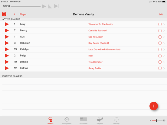 Walkout song DJ makes the difficult task of playing a walkout song for each individual batter as easy as tapping a button. Simply enter the player name and number then select a song from your iTunes library. The precise segment from that walkout song can then be set by selecting a position and playback duration using a simple and precise editing view. Press the play button and 11 seconds later you have one pumped-up batter, and a song that smoothly fades as the batter steps up to the plate. You can also choose between imported, recorded, or computerized text-to-speech announcements for your players before, after, or mixed with their walkout song.