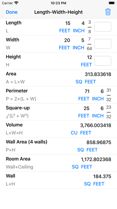 Decimal Inches, and Yards. Enter the Length and Width to calculate Area, Perimeter (of a room), and Square-up. In addition, enter the Height to calculate the Volume, Wall Area, and Total Room Area. You can enter any single length value and convert it to other dimensions, for example from Feet-Inch-Fractions to Decimal Feet or Decimal Inches or back. Furthermore you can tap on any calculated dimension to convert it to other dimensions. If the calculated value is Volume you can tap and see its conversion to Board Feet.