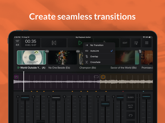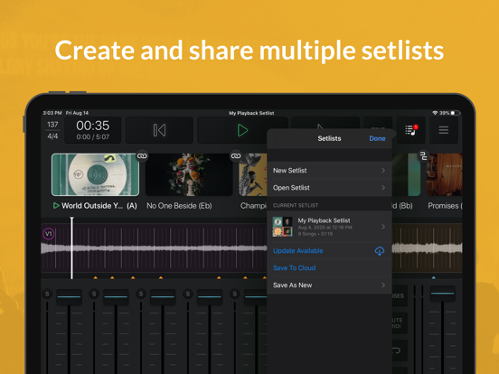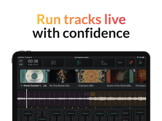 Playback turns your iPad or iPhone into a simple, yet powerful MultiTrack player for all of your MultiTracks, CustomMix®, and MultiTracks Cloud Pro® content. Playback has three subscription levels: Intro (Free), Pro, and Premium; all with a 30-day free trial. Playback contains many features, like Built-In Click, Pads, and Transitions. With “Play of the Week”, we release a new, free MultiTrack each week, so you can try out all of the features in Playback right away.