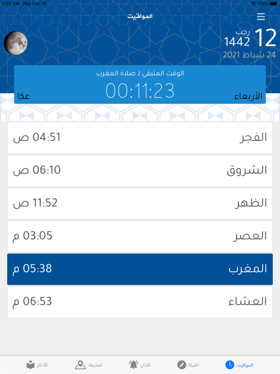 البرنامج الوحيد الذي يعرض مواقيت الصلاة بدقة تامة بدون تأخير دقيقة أو تقديمها حسب التقويم المعتمد (اي يعمل مثل موقتة الاوائل في المساجد).