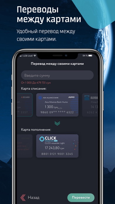 Возможность переводить денежные средства непосредственно со счета одной онлайн пластиковой карты на другую онлайн пластиковую карту. Доступен перевод, а также и запрос средств CLICK -пользователю по номеру телефона, по номеру карты, а так же перевод между своими картами. Возможность оставлять комментарий к переводу.