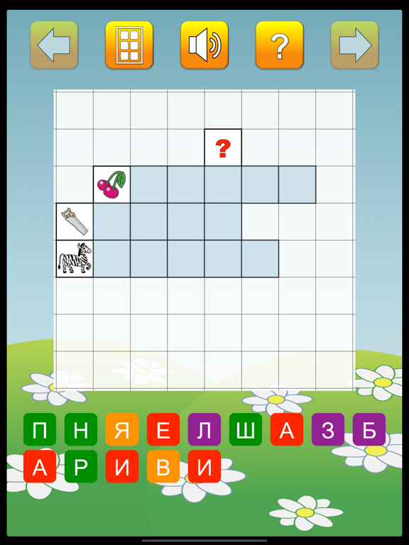 Все слова загаданы с помощью картинок. Для малышей, только начинающих обучение чтению и письму, есть режим подсказки.