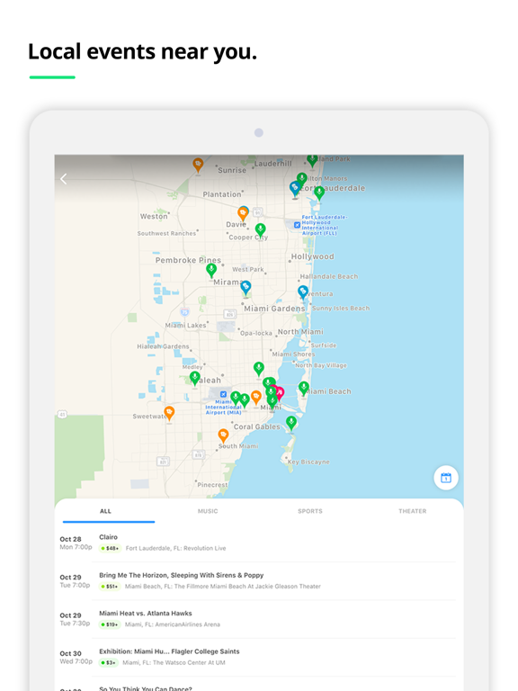 Discovery – Find last minute events and just-announced concerts in your area – or search any team, artist, event or venue to see schedules and available tickets.