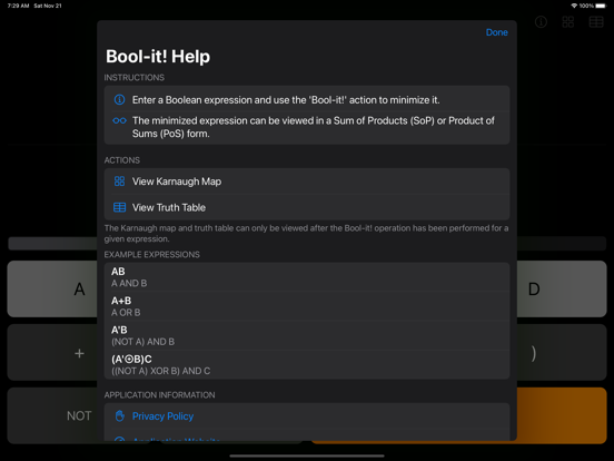 Whether you are just getting started with Boolean logic or are more advanced with complex expressions, this application is a must-have. With Bool-it!, you can simplify your Boolean expressions to Sum of Products (SoP) and Product of Sums (PoS) forms, view their truth tables, and analyze their Karnaugh maps.