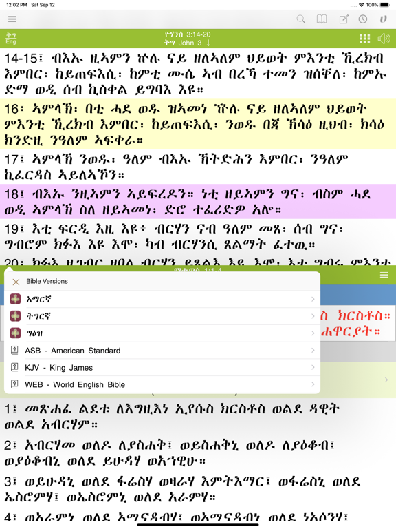 We are grateful to the many volunteers who typed up the Tigrigna Bible, and our appreciation to geezexperience.com. The English Bible translations ASB, KJV and WEB are in the public domain, God bless those who made it possible. We are grateful for the many groups of volunteers who work tirelessly to make the quality and accuracy of the app possible - BLESS YOU!
