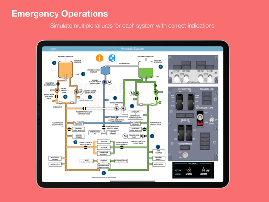 The app allows you to manipulate the systems to see how each part will react. Simulate emergencies to see if you can correct the problem with your checklist.