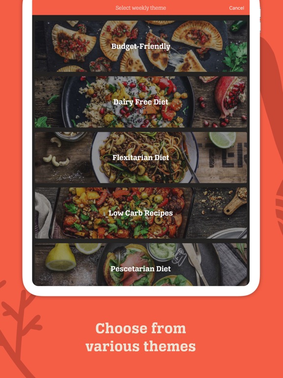 • Choose individual plans from the meal plan menu like „under 5 ingredients“ or „gluten-free“